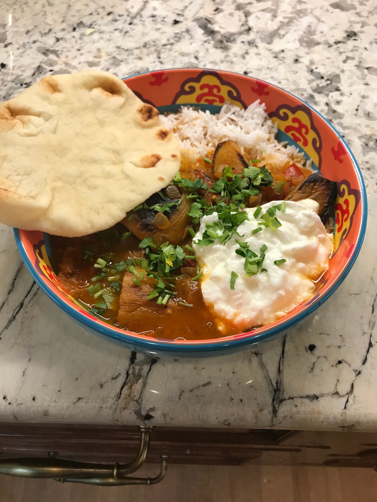 Khoresh Bademjan from the October 2020 Bon Appétit. A tasty Persian eggplant-tomato stew, and we got to use eggplants and tomatoes from the garden. Very tasty, we give it a 5.