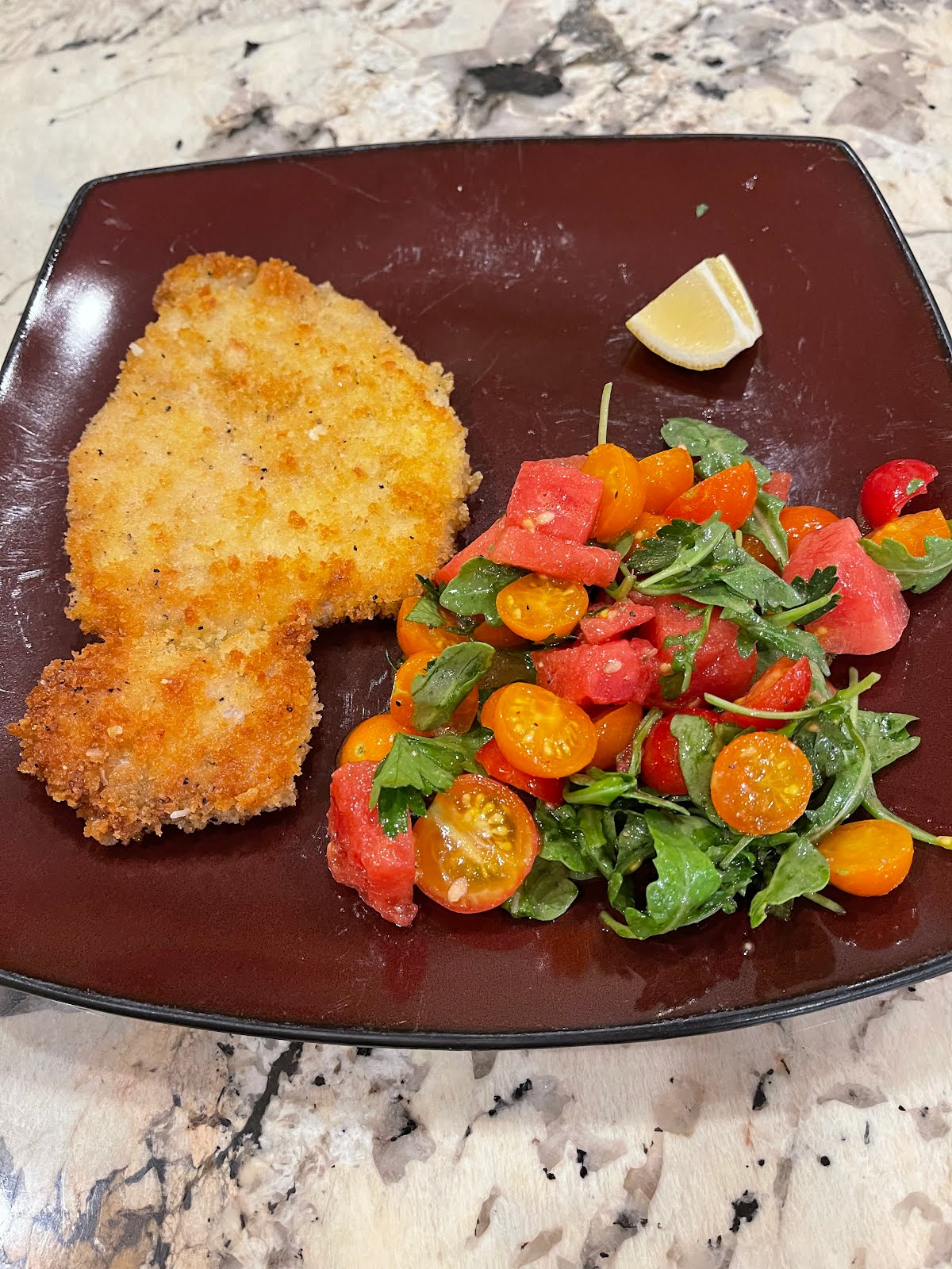 Pork Tonkatsu with Watermelon Tomato Salad from Epicurious. This is really delicious! We give this a 5.